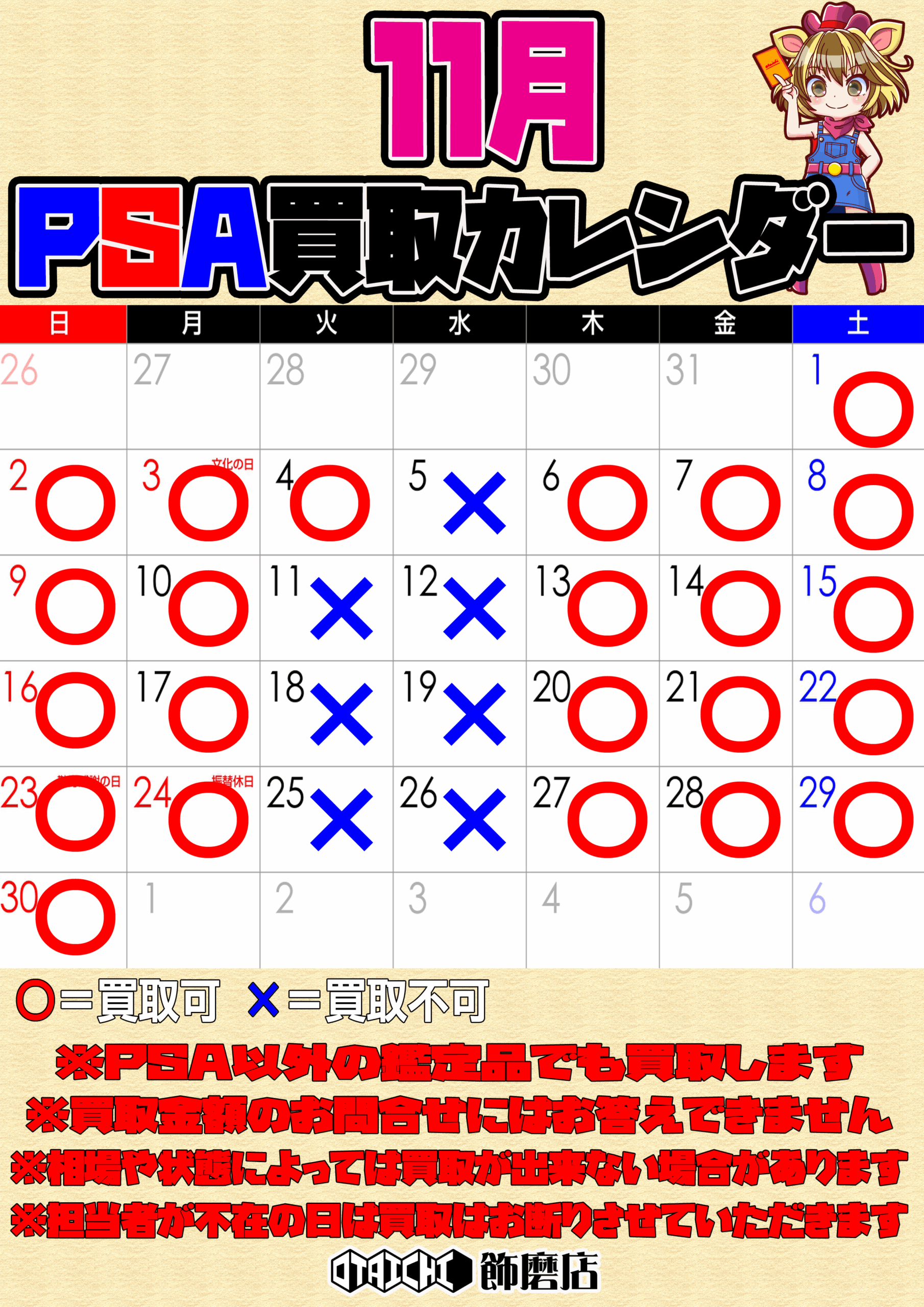 【飾磨店】11月PSA買取カレンダー